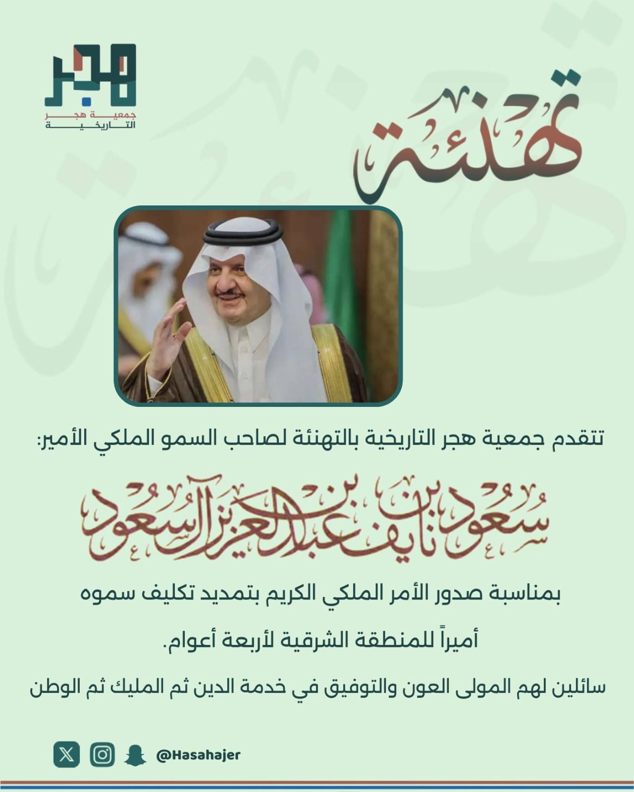 تتقدم جمعية هجر التاريخية بالتهنئة لصاحب السمو الملكي الأميرسعود بن نايف بن عبدالعزيز ال سعود أميرمنطقة الشرقية