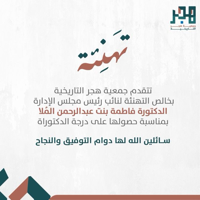 تتقدم جمعية هجر التاريخية لنائبة مجلس الإدارة الدكتورة فاطمة بنت عبدالرحمن الملا بمناسبة حصولها على درجة الدكتوراة بإمتياز.. سائلين الله لها دوام التوفيق والنجاح ، وأن ينفع بها وبعلمها .