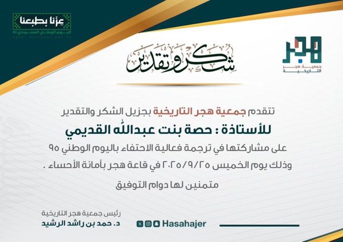 ‏تتقدم جمعية هجر التاريخية بجزيل الشكر والتقدير للأستاذة : حصة بنت عبدالله القديمي على مشاركتها في ترجمة فعالية الاحتفاء باليوم الوطني ٩٥ وذلك يوم الخميس ٢٥ / ٩ / ٢٠٢٥ في قاعة هجر بأمانة الأحساء .