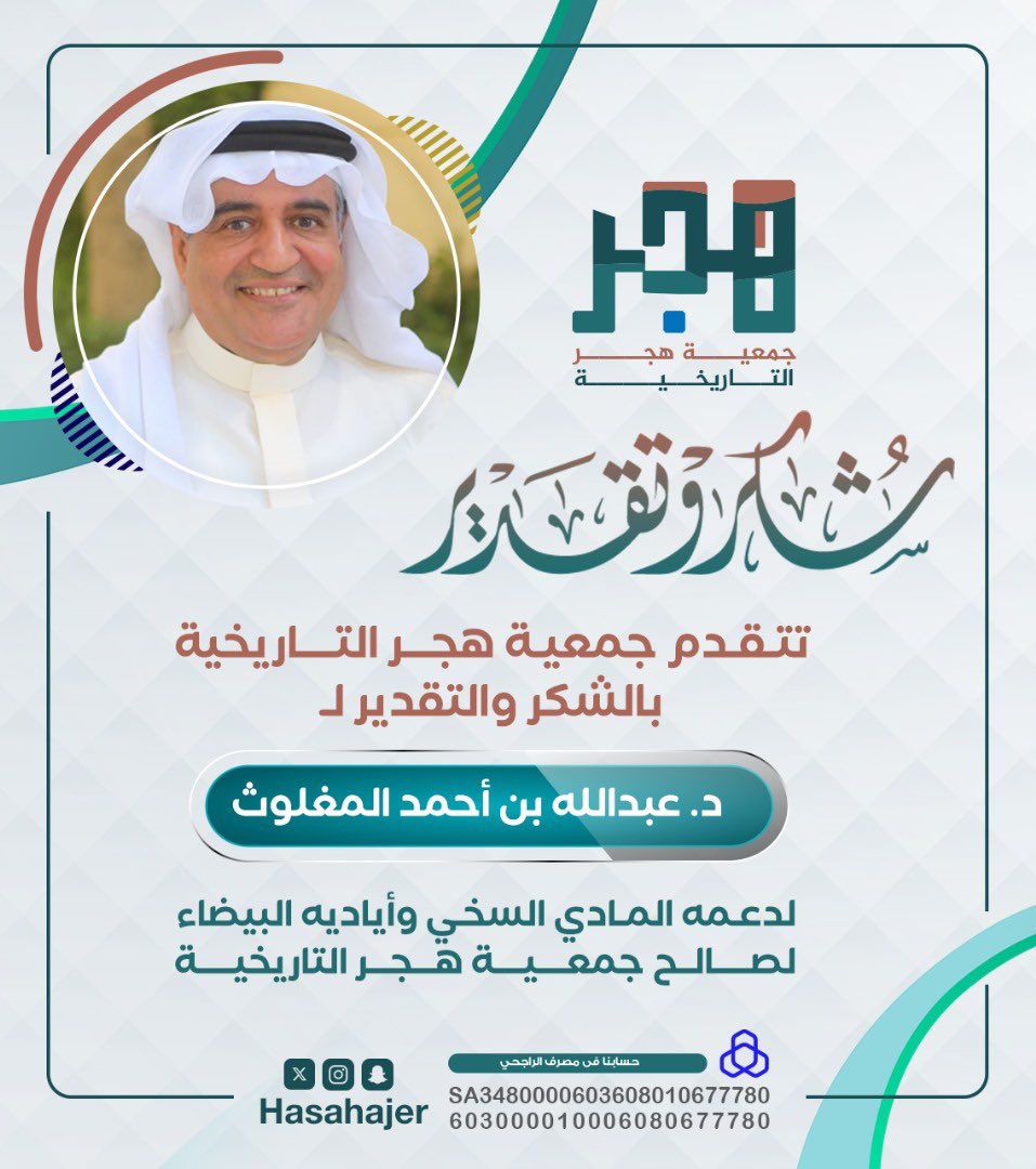 ‏تتقدم جمعية هجر التاريخية بجزيل الشكر والتقدير لسعادة الدكتور عبدالله بن أحمد المغلوث