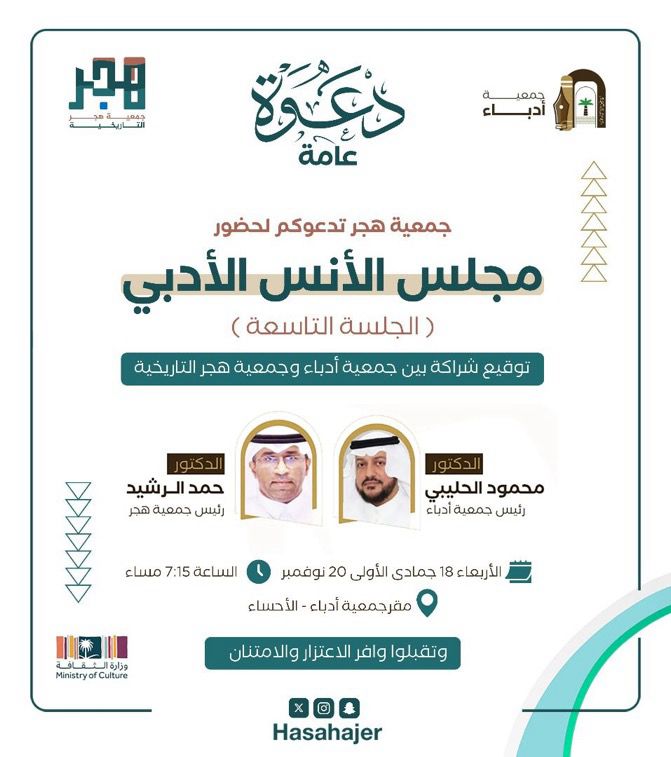 ‏[مجلس الأنس الأدبي] غداً الأربعاء ١٨ /٥ /١٤٤٦ الموافق ٢٠/١١/٢٠٢٤ للحديث عن هجر التاريخية وتطلعاتها .